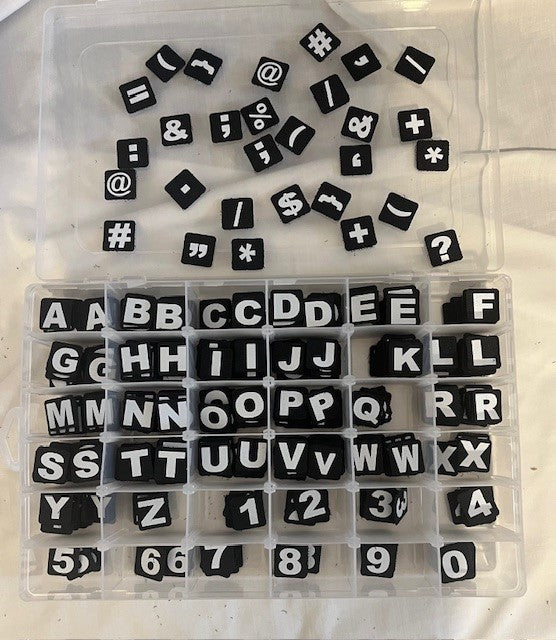 - 1 Bag of 100 hook 2cm square letters, numbers, and symbols for mix and match customized name bands. Most popular letters are repeated with limited numbers and symbols.