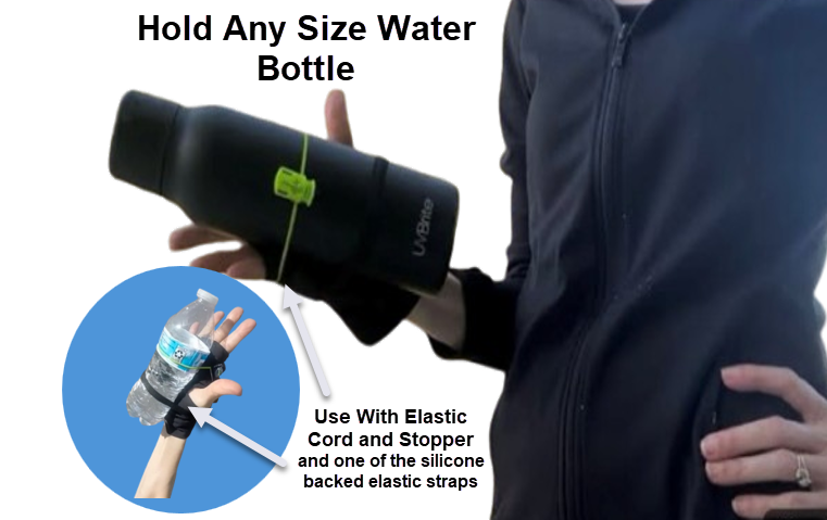 Silicone-backed elastic strap secures any size phone. Adjust strap for screen access or optimal fit. Use the adjustable elastic cord to hold any size water bottle securely.